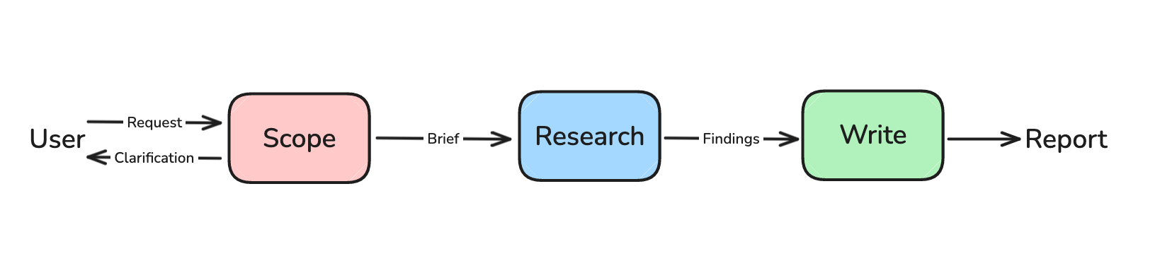 OpenAI has made the point that users rarely provide sufficient context in a research request. We use a chat model to ask for additional context if necessary.