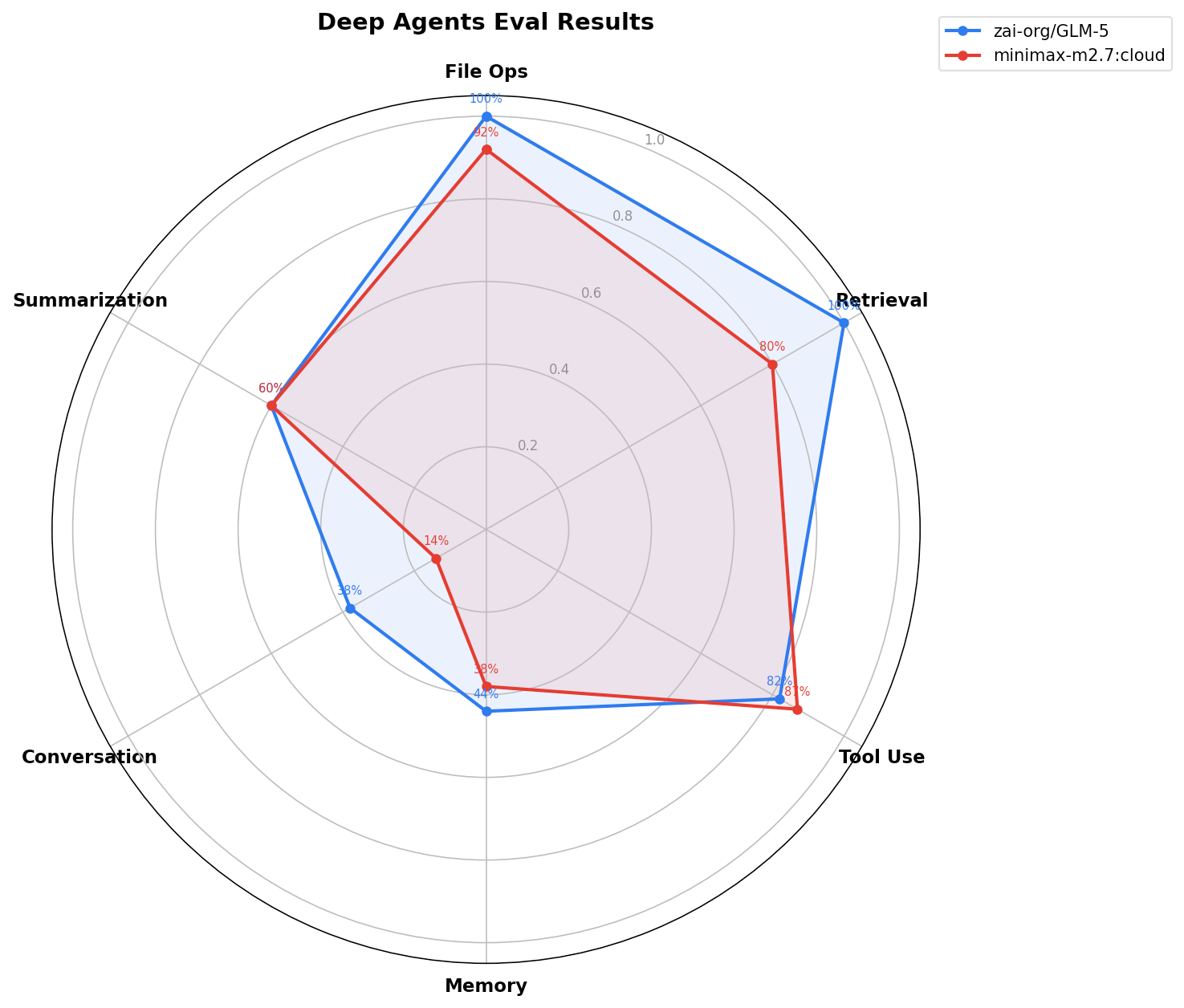 Over the past few weeks, we’ve been running open weight Large Language Models through Deep Agents harness evaluations, and the initial results show they are a viable option to use instead of, and alongside, closed frontier models. GLM-5 (z.ai) and MiniMax M2.7 each score similarly to closed frontier models on core agent tasks such as file operations, tool use, and instruction following.