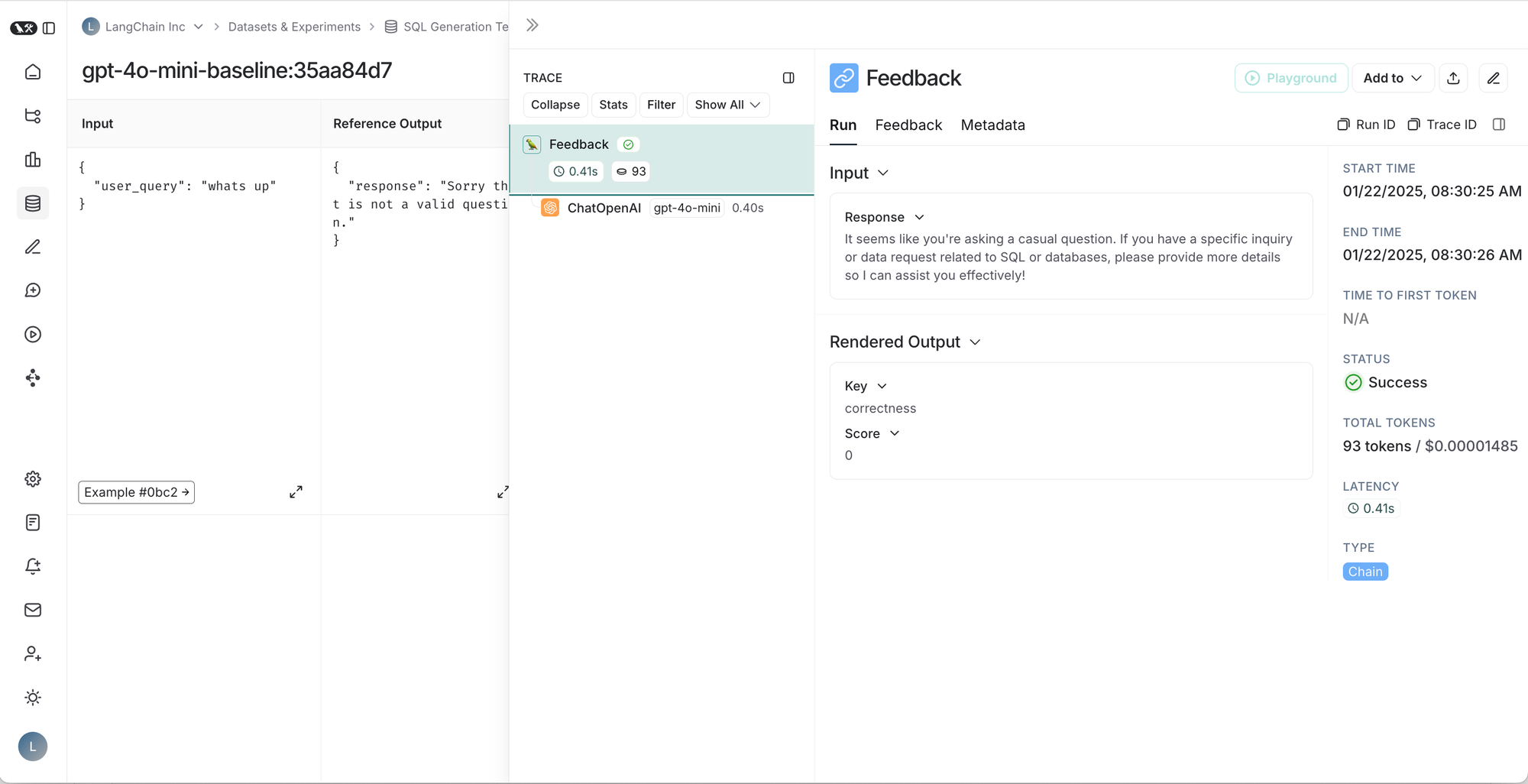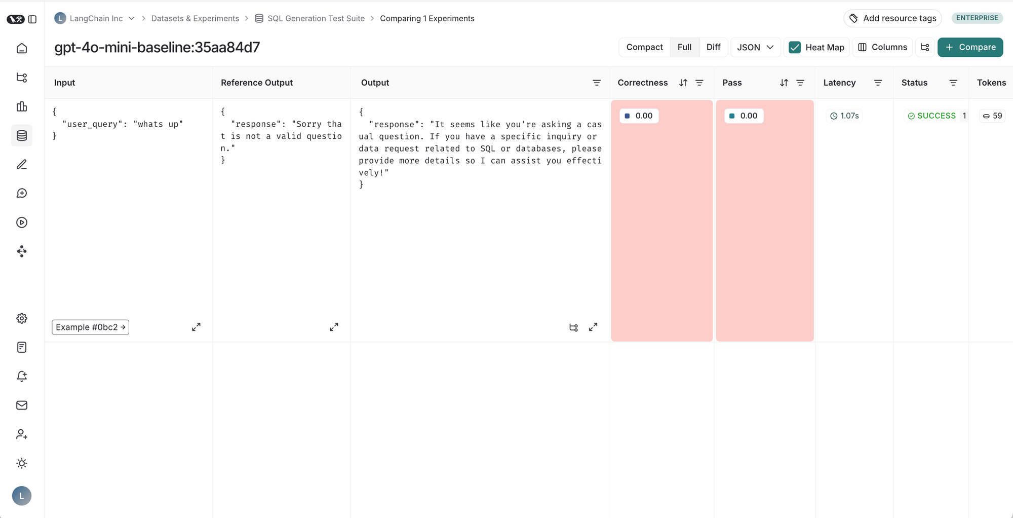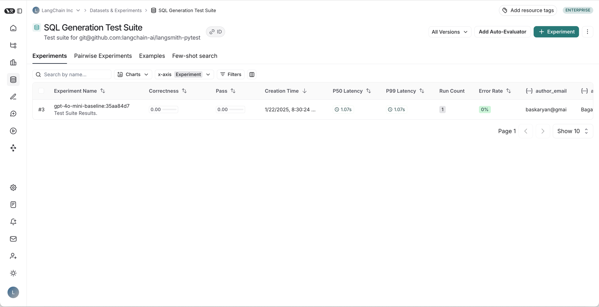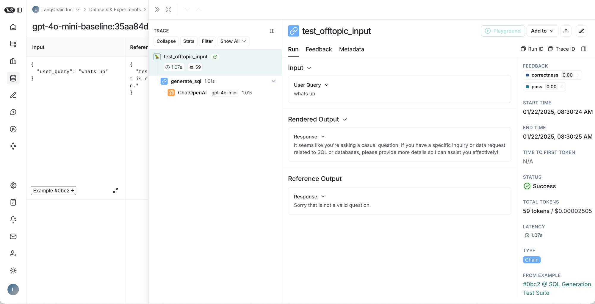Here’s a simple test case to demonstrate how to evaluate an application that generates SQL queries. This test checks whether the application correctly identifies off-topic user input and logs the results to LangSmith. When you run a test suite, a dataset in LangSmith will be created/updated and a new experiment will be created.