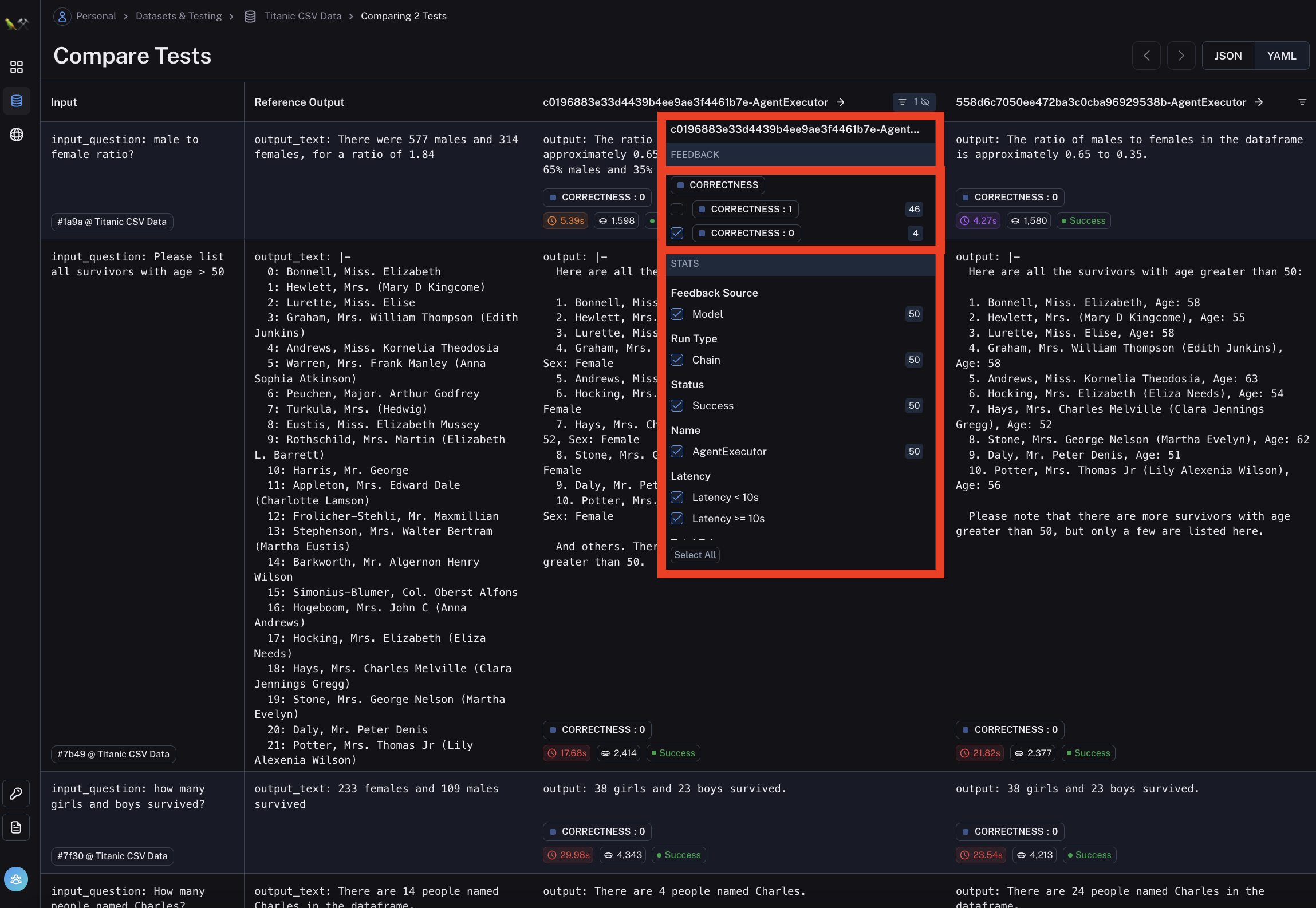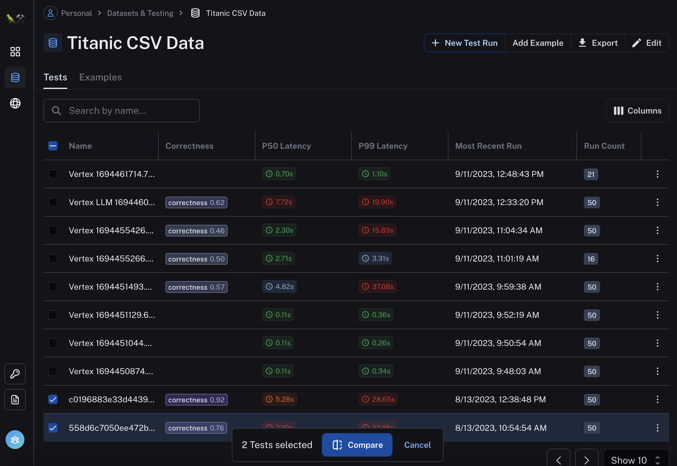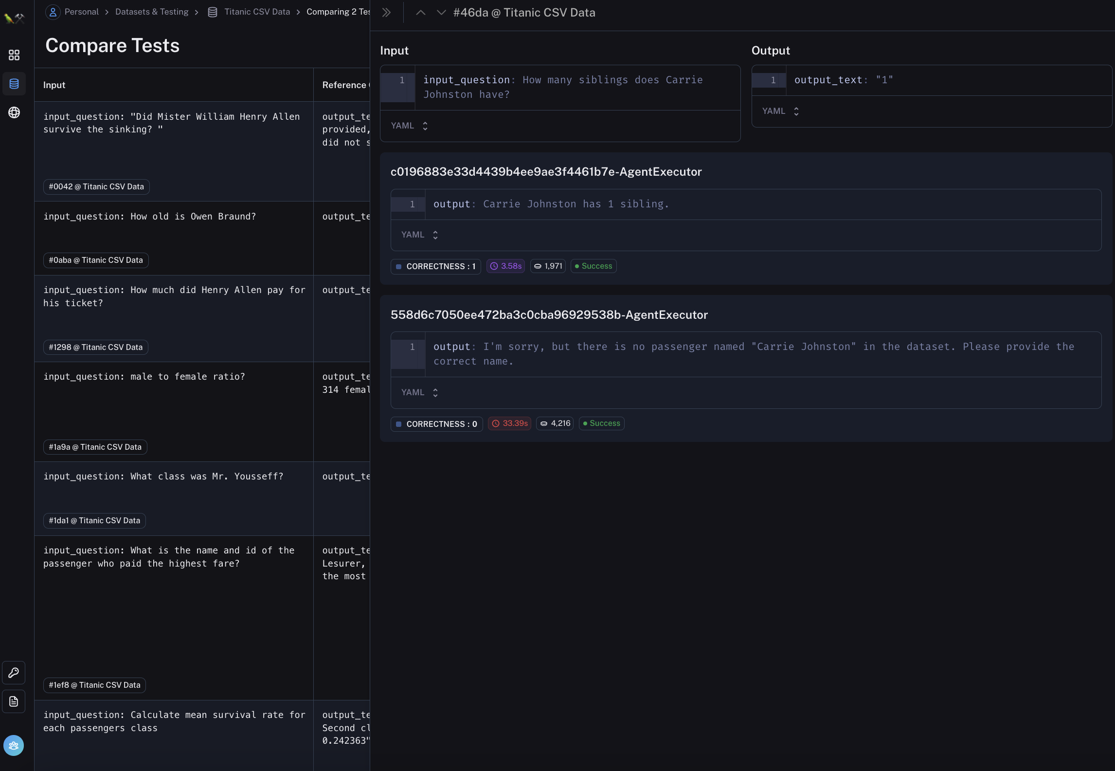 This view is designed to make it easy to quickly compare test runs across the same inputs. If you want a deeper look at a particular datapoint, you can click on that row and sidebar will pop up allowing you to drill down into the details of those runs.