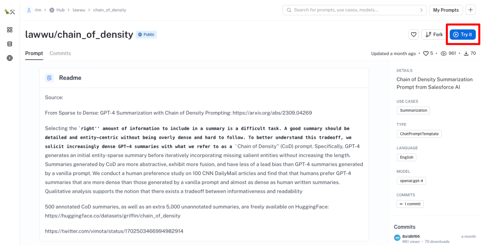 - https://smith.langchain.com/hub/lawwu/chain_of_density