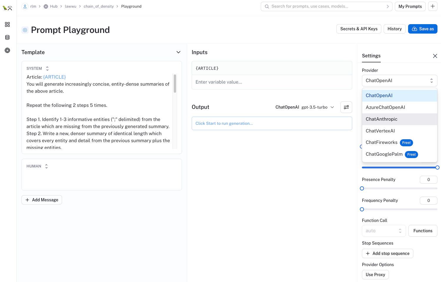 This will open a playground for workshopping and debugging prompts with a broad set of different LLMs, many of which are free to use: