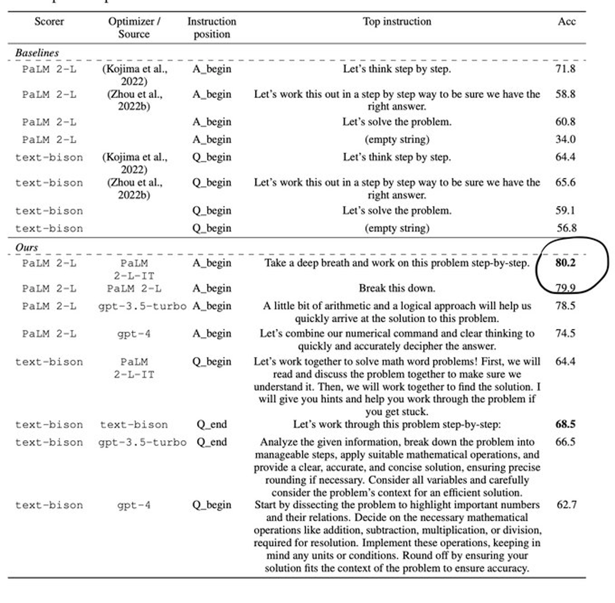Deepmind recently used LLMs to optimize prompts, and converged to Take a deep breath and work on this problem step-by-step as the best performing optimization. Going forward, this points to some interesting potential for translation modules between human instruction and LLM-optimized prompts.