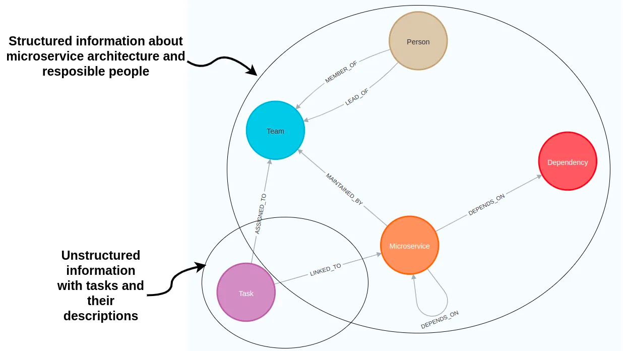 Say, for example, you wanted to create a chatbot that could answer questions about your microservice architecture, ongoing tasks, and more. Tasks are mostly defined as unstructured text, so there wouldn’t be anything different from the usual RAG workflow there. However, how could you prepare information about your microservices architecture so the chatbot can retrieve up-to-date information? One option would be to create daily snapshots of the architecture and transform them into text that the LLM would understand. However, what if there is a better approach? Meet knowledge graphs, which can store both structured and unstructured information in a single database.