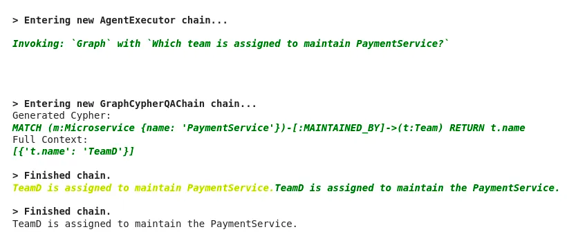 response = mrkl.run("Which team is assigned to maintain PaymentService?")