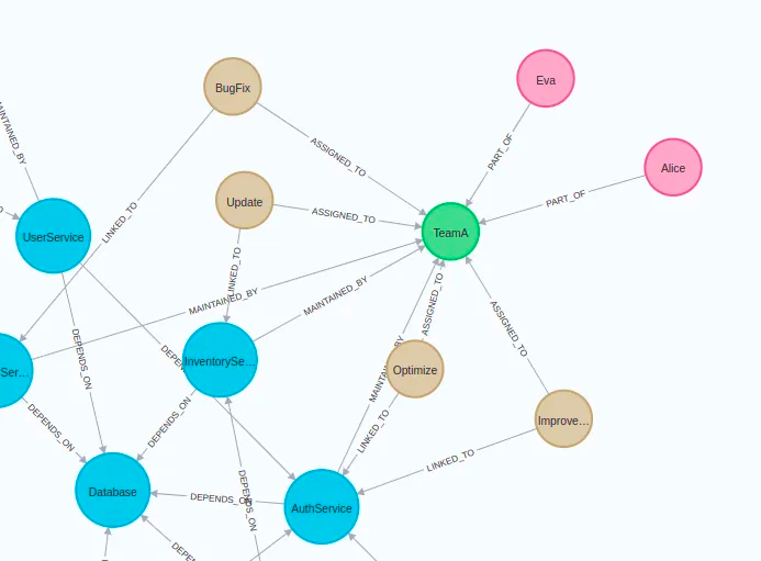 Blue nodes describe microservices. These microservices may have dependencies on one another, implying that the functioning or the outcome of one might be reliant on another’s operation. On the other hand, the brown nodes represent tasks that are directly linked to these microservices. Besides showing how things are set up and their linked tasks, our graph also shows which teams are in charge of what.