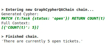 The response seems valid, and the LLM uses assertive language, making you believe the result is correct. However, the problem is that the response directly correlates to the number of retrieved documents from the vector index, which is four by default. What actually happens is that the vector index retrieves four open tickets, and the LLM unquestioningly believes that those are all the open tickets. However, the truth is different, and we can validate it using a Cypher statement.