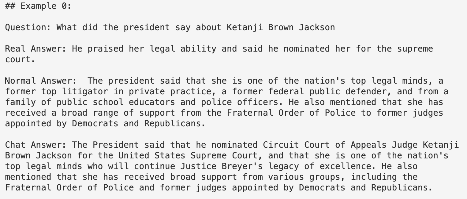 We can see in this example that the GPT3 is nearly exactly the same as the real answer. This is almost certainly due to the fact that we used GPT3 to generate the question/answer pairs. The ChatGPT answer is more verbose, and while not technically incorrectly it is not as specific and direct as the GPT3 answer. Again, this is likely due to using GPT3 to generate the question/answer pairs. Note for self: may want to manually curate a test set for the future.
